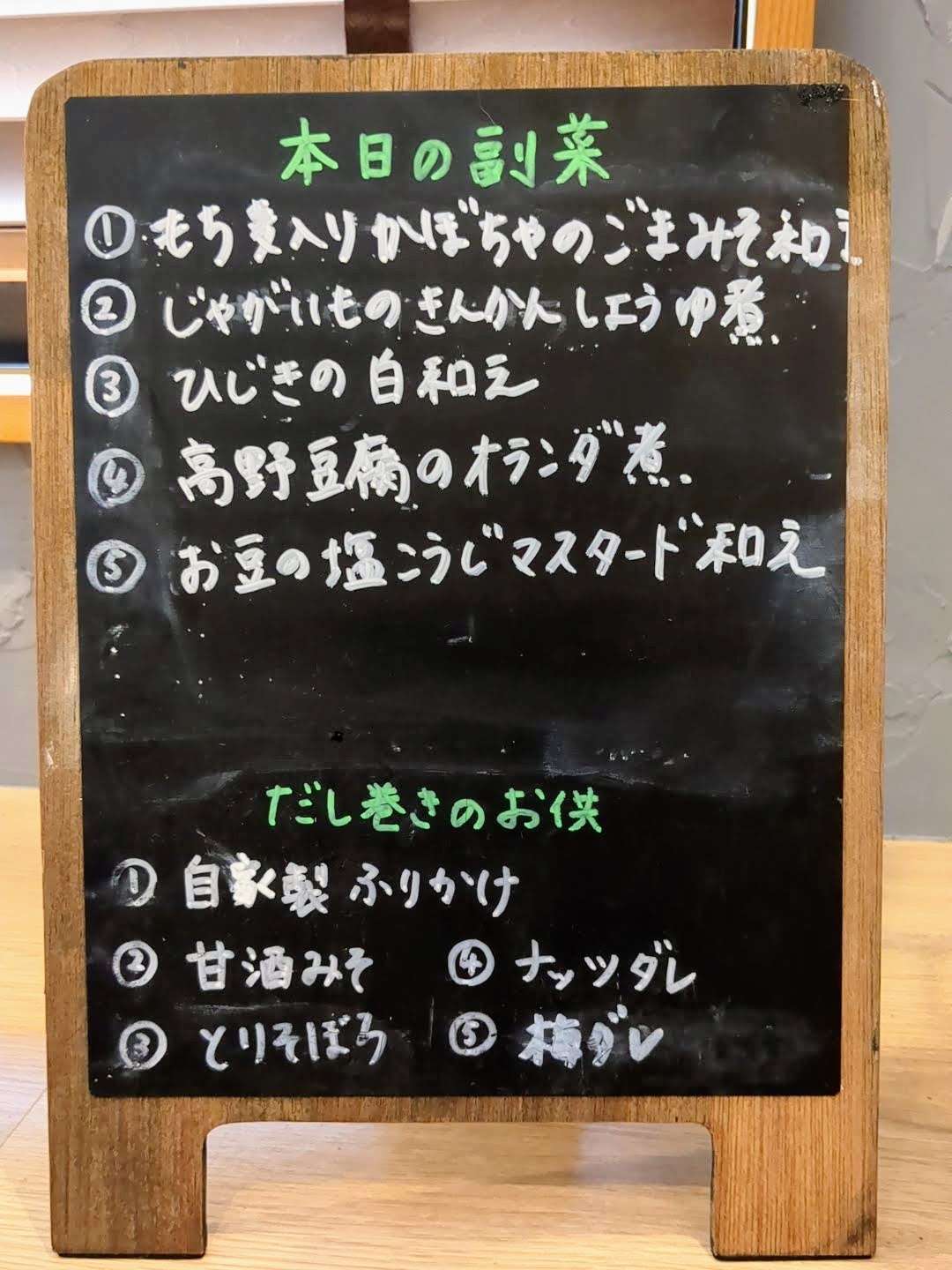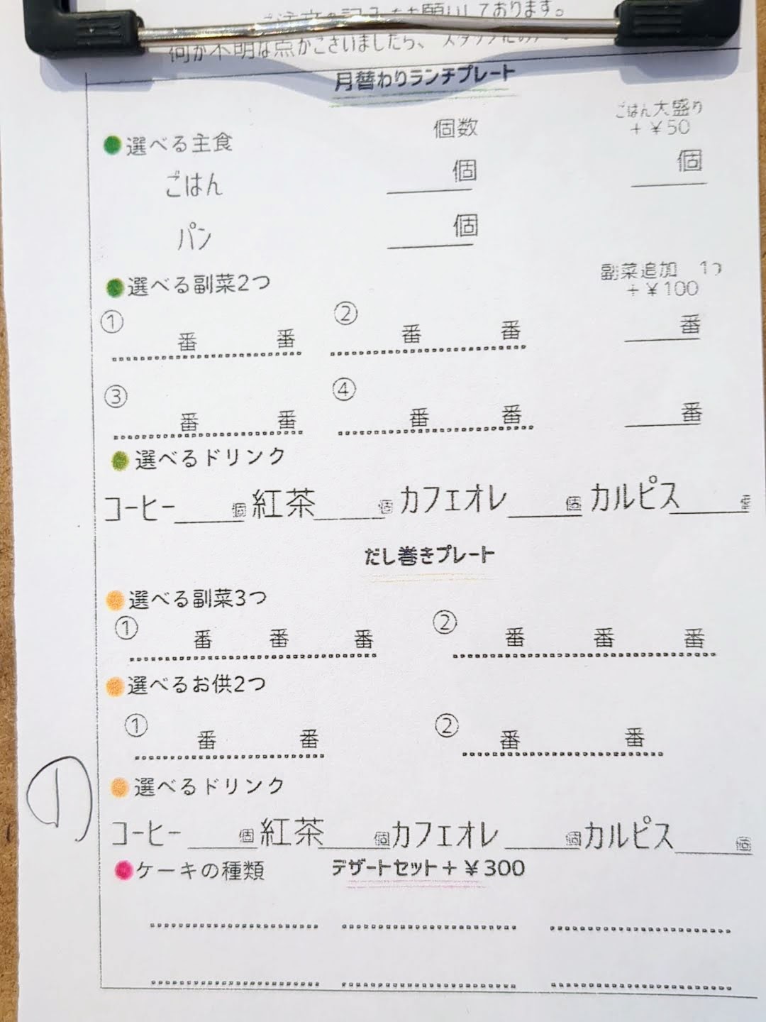 月替りランチプレートの場合は、選べる副菜2種とドリンクを書き込みます。だし巻きプレートの場合は、選べる副菜3種、選べるご飯のお供2種、ドリンクを書き込みます。