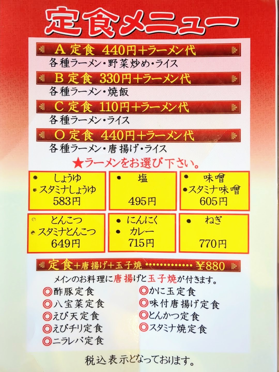 定食は、ラーメンのセットとメイン料理を選べるセットがありました。