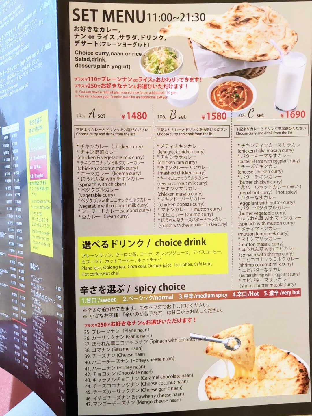 プラス250円で、好きなナンを選べます。カーリックナン、ほうれん草ココナッツナン、ゴマナン、チーズナン、ハニーチーズナン、ハーニナン、チョコナン、キャラメルチョコナン、チーズココナッツナン、チーズカーリックナン、イチゴチーズナン、マンゴーチーズナンがありました。珍しいイチゴチーズナンやマンゴーチーズナンまでありました。