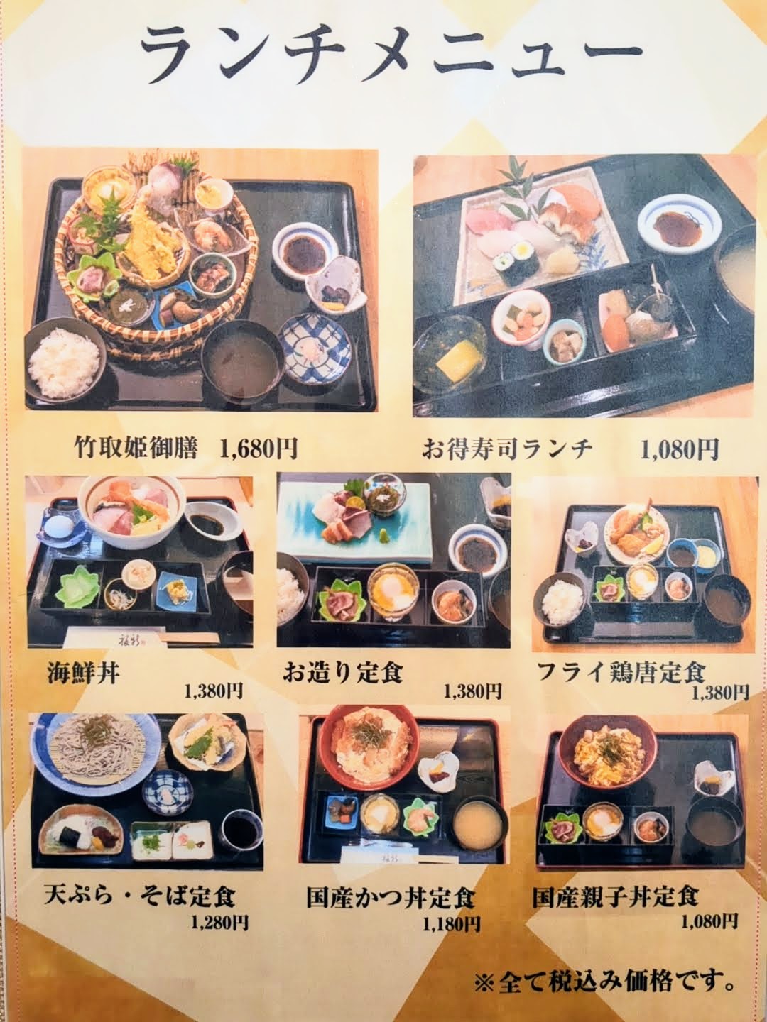 竹取姫御膳(税込1,680円)とお得寿司ランチ(税込1,080円)が、福新の人気メニューのようです。