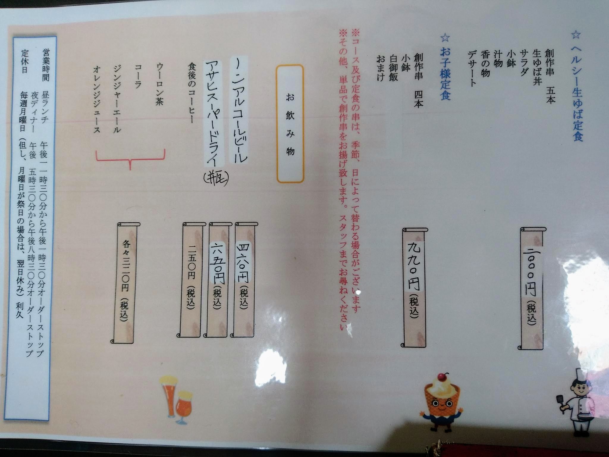 お昼のミニコース(税込3,350円)は、創作串が12本になって、スティックサラダが追加されて、ご飯が生ゆば丼又はお茶漬けに変わります。
