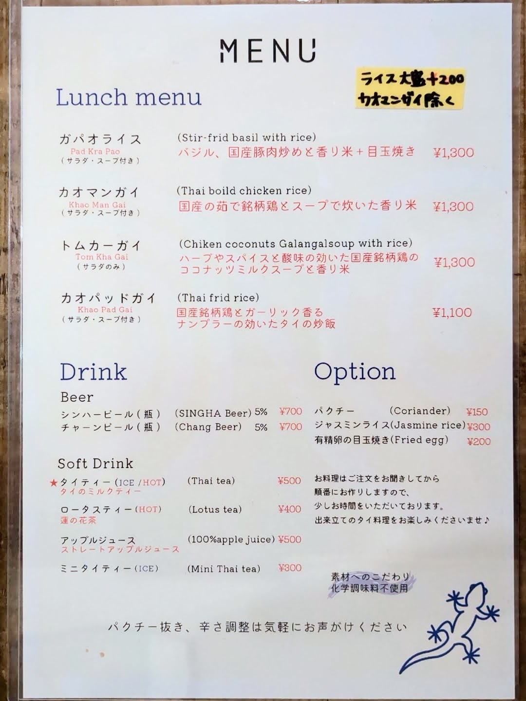 ガパオライスとカオマンガイは、代表的なタイ料理です。パッタイ、トムヤムクン、グリーンカレーもそうですが、ありませんでした。メニューは厳選しているようです。