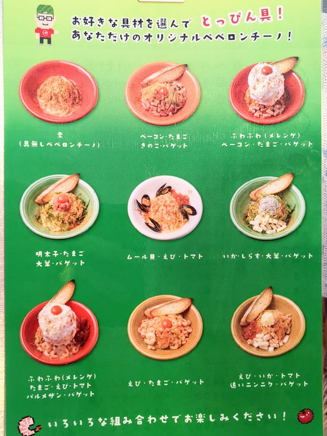 メニューはペペロンチーノが基本で、並盛りと大盛りがあります。
