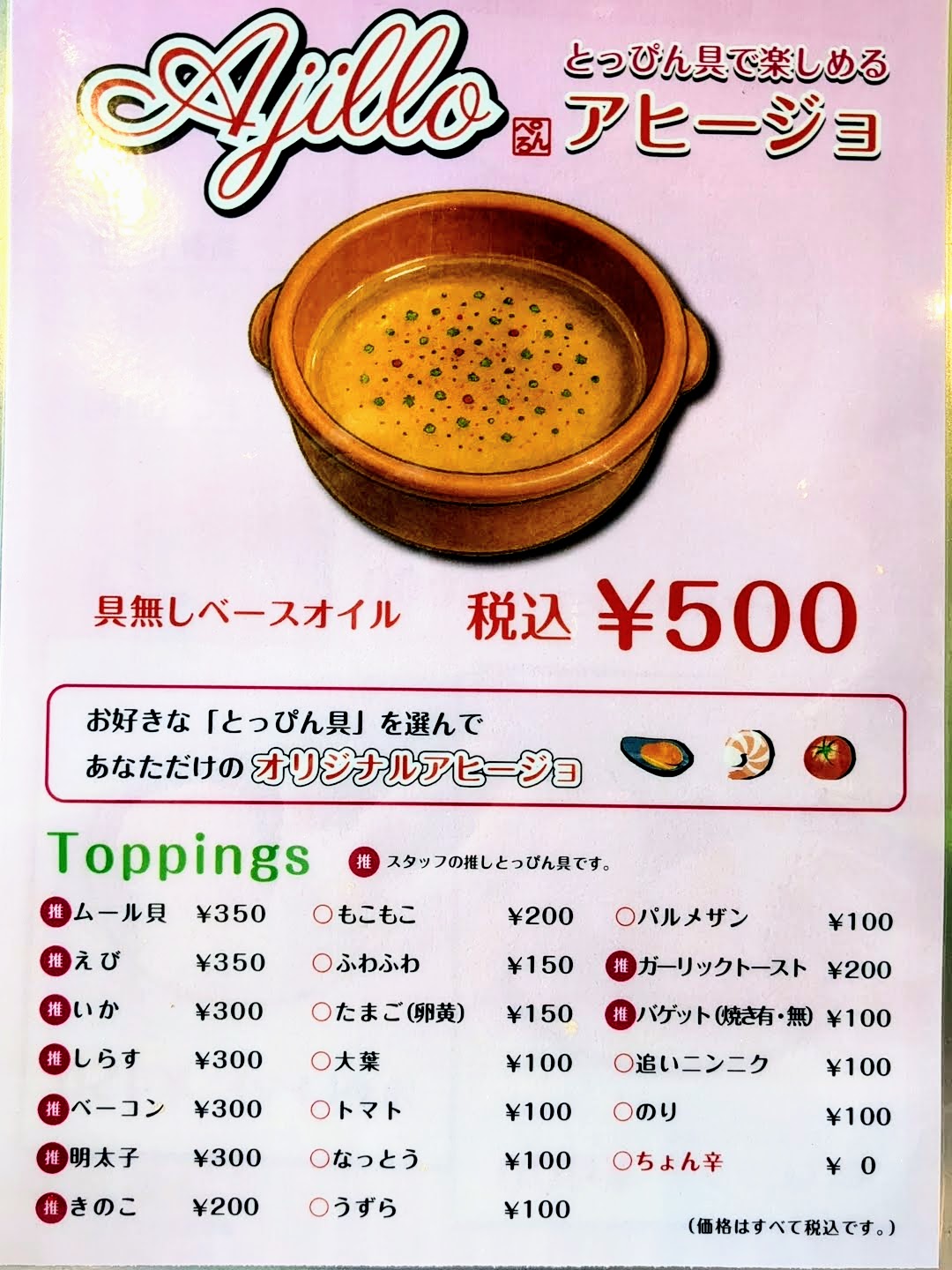 トッピングが100円から350円まで約20種類あって、自由に選びます。トッピングは注意しないと、結構な金額になりそうです。