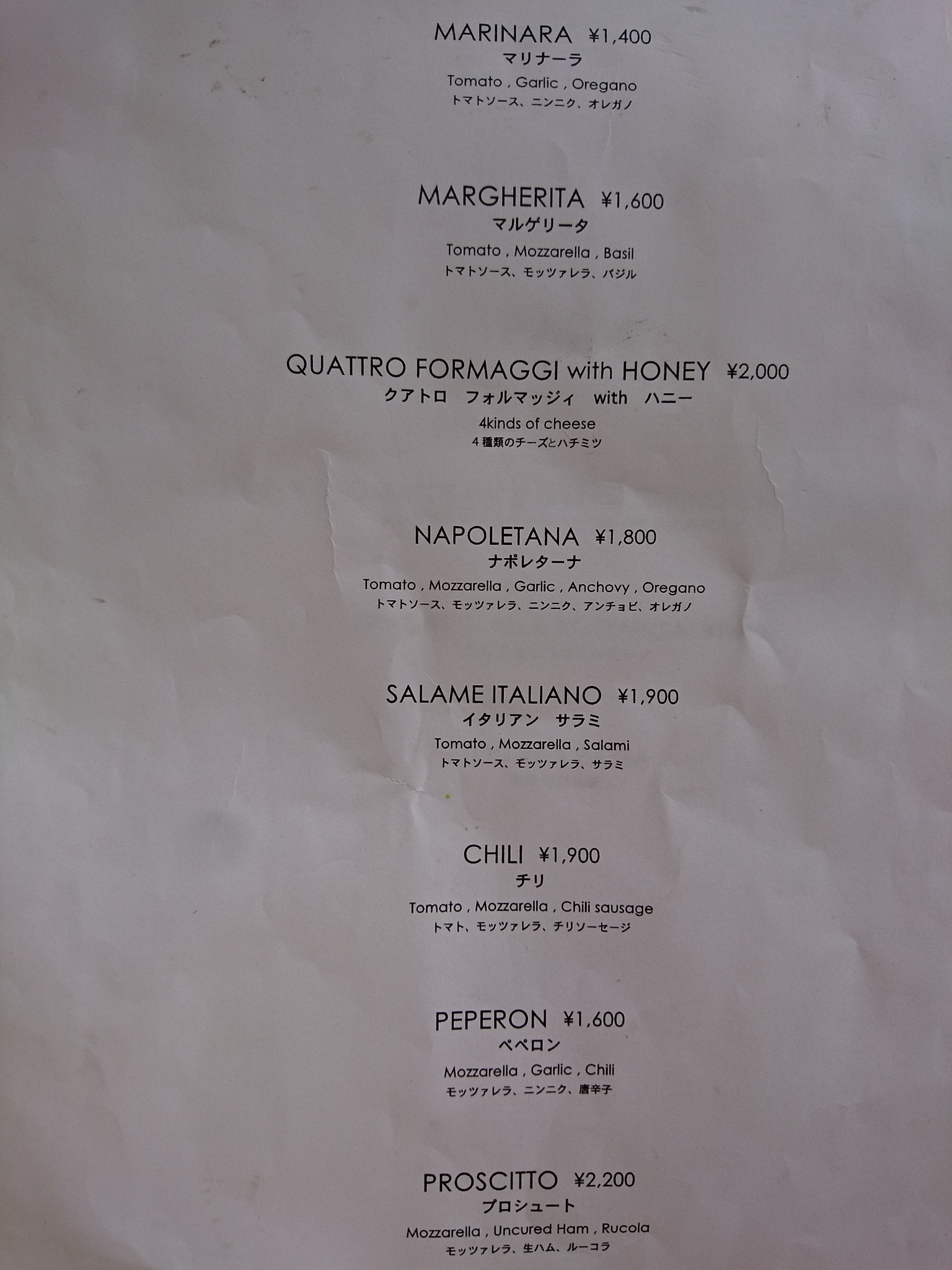 定番メニューのマルゲリータ(税込1,600円)、クアトロフォルマッジ(税込2,000円)も気になりました。