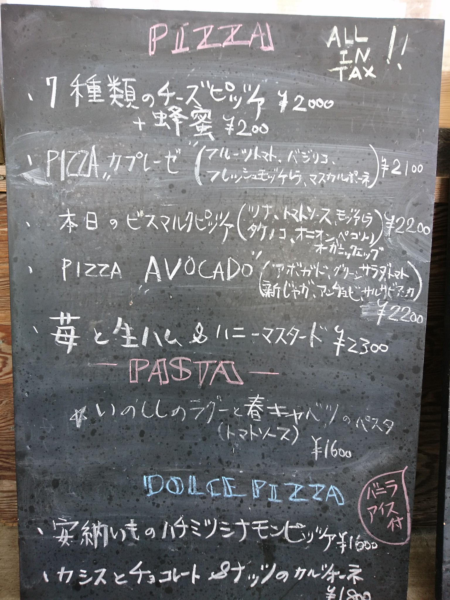 ピッツァアボカド(税込2,200円)と本日のビスマルクピッツァ(税込2,200円)をお願いしました。2人分です。
