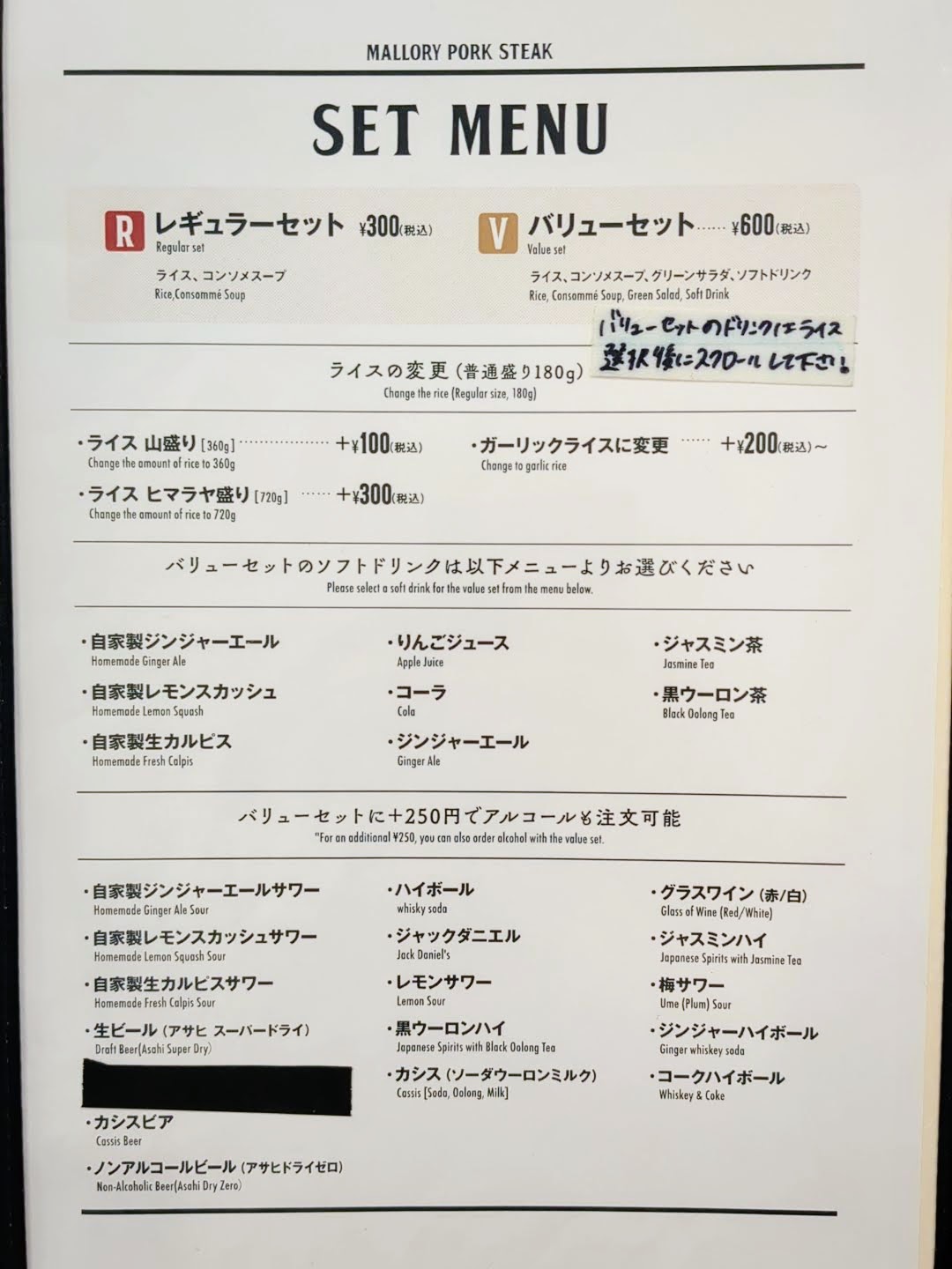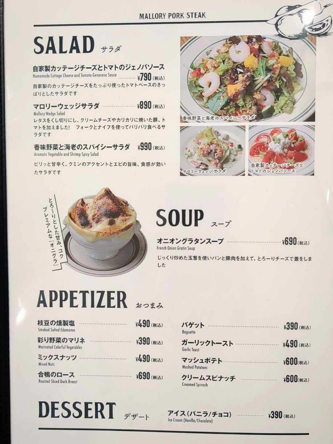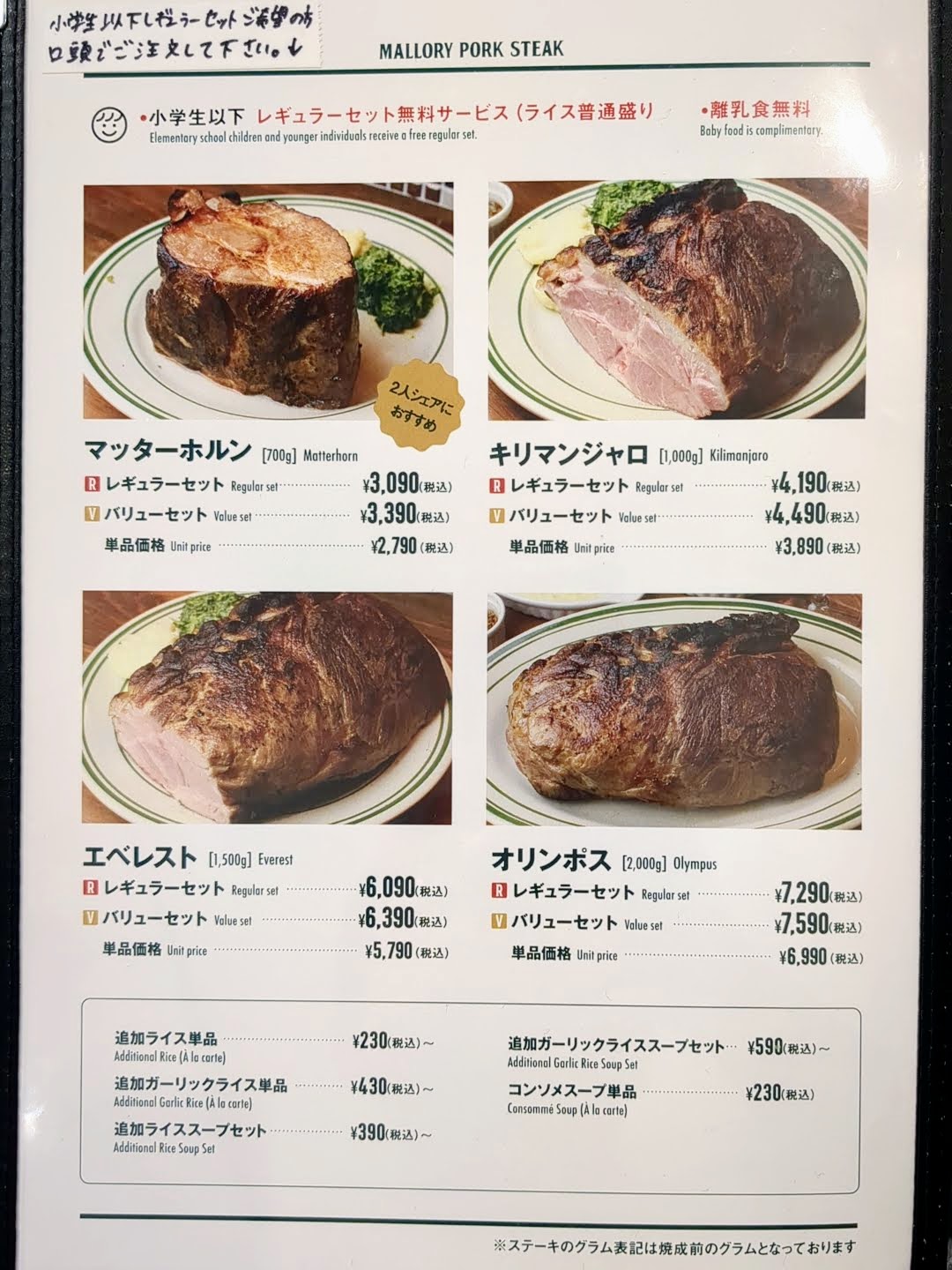 マロリーポークステーキの食事のメニューは、ポークステーキのみで、ボリュームの違いによって、メニューが異なります。
