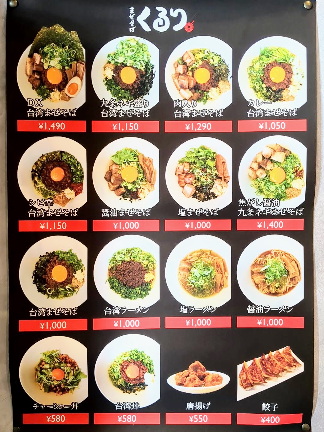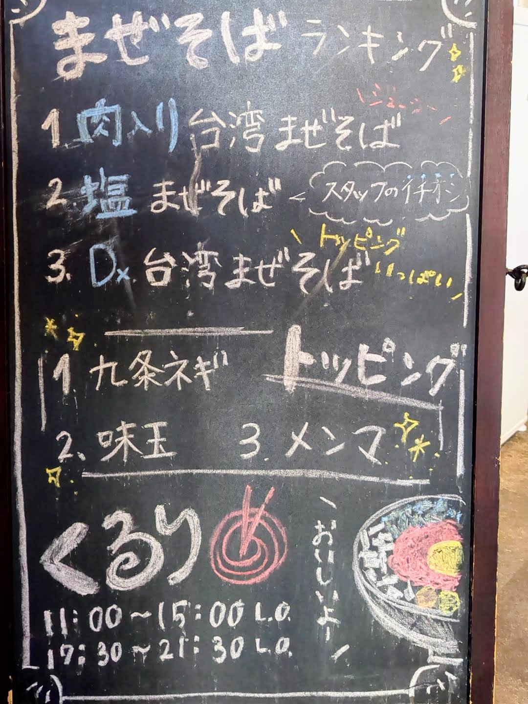 台湾まぜそばが「まぜそば くるり」の看板メニューです。トッピングのメニューがいくつかありました。
