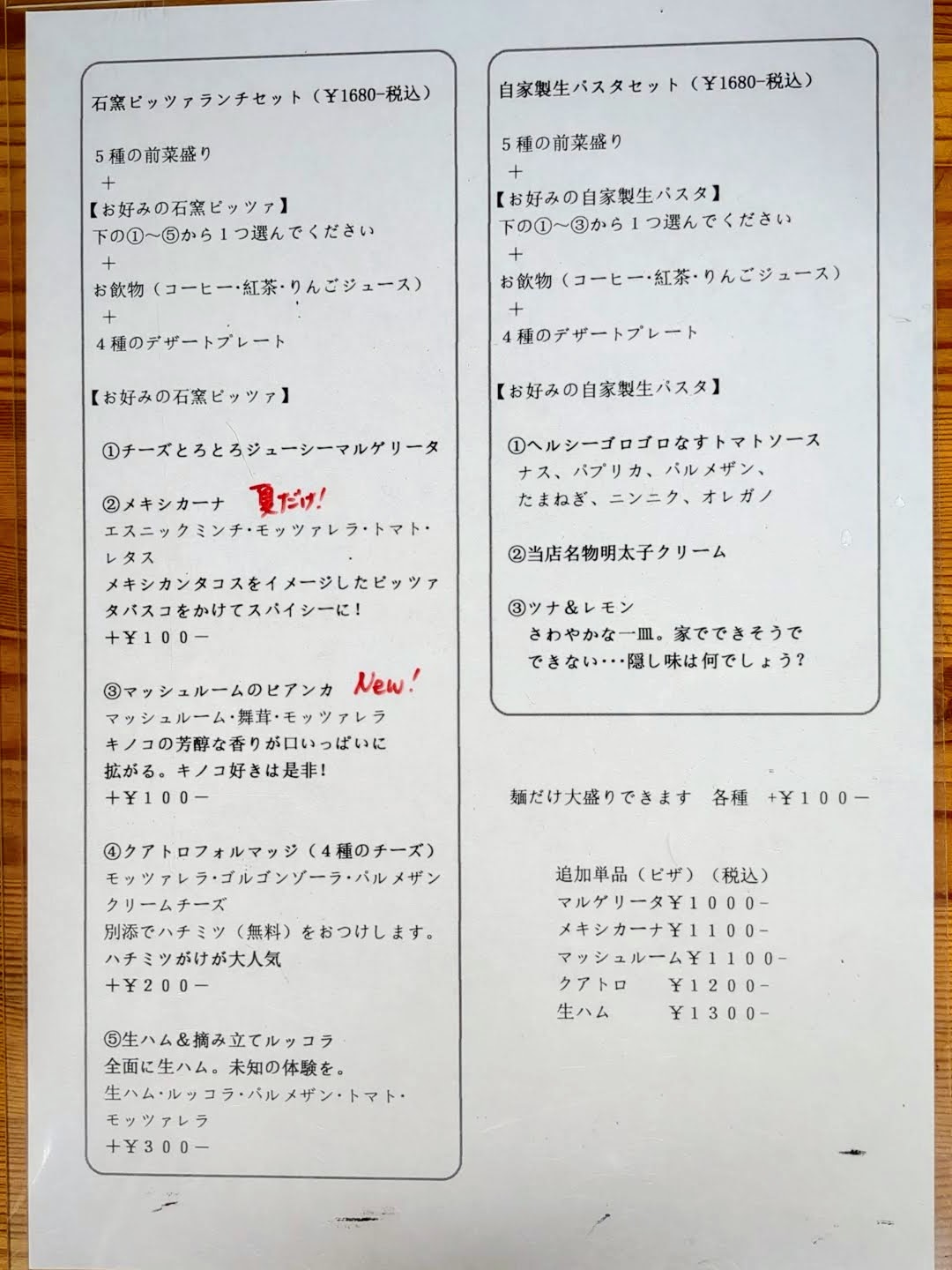 メニューは、本日のランチセット(税込1,680円から)だけで、ピッツァが5種類、パスタが3種類からメインを選びます。