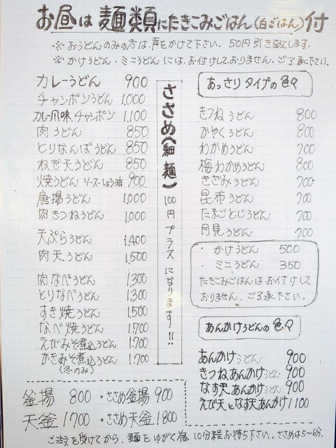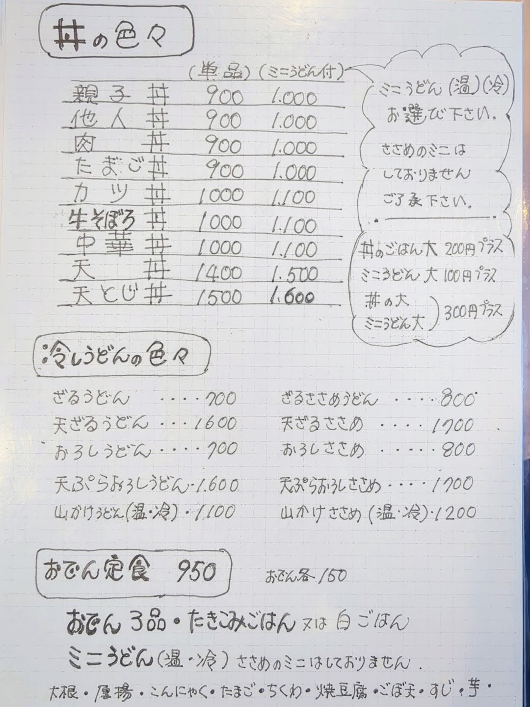 メニューは、うどん、あっさりタイプ、あんかけうどん、丼、冷やしうどん、おでん定食に分類されていました。