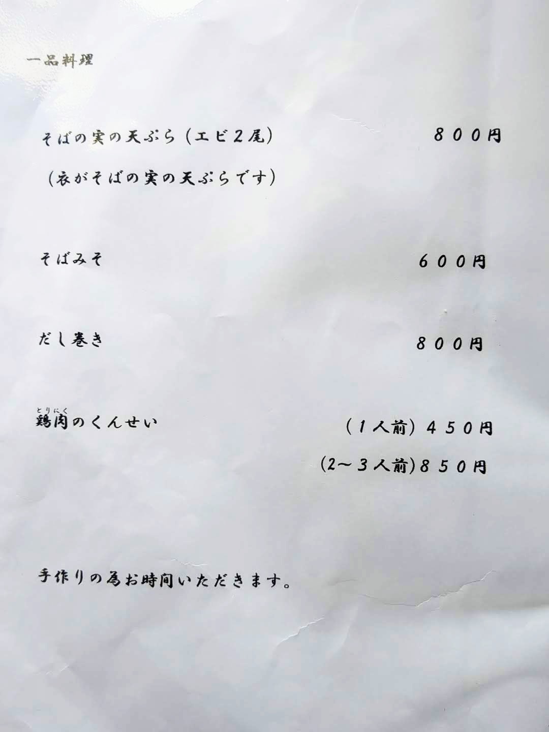 メニューは、冷たい蕎麦、温かい蕎麦、一品料理がありました。
