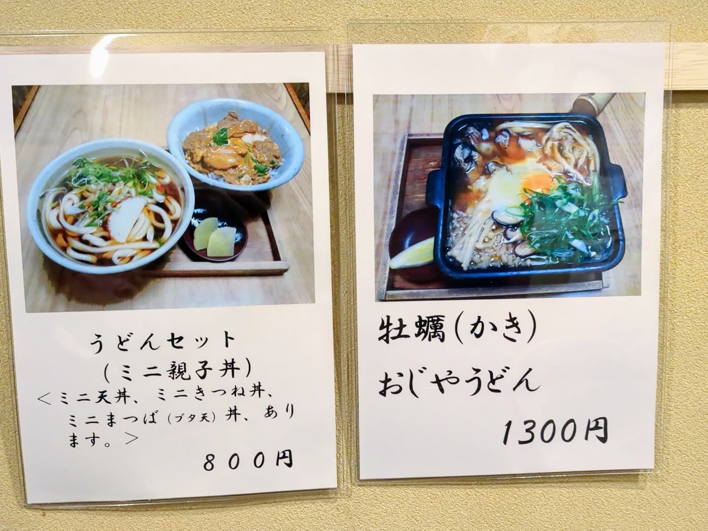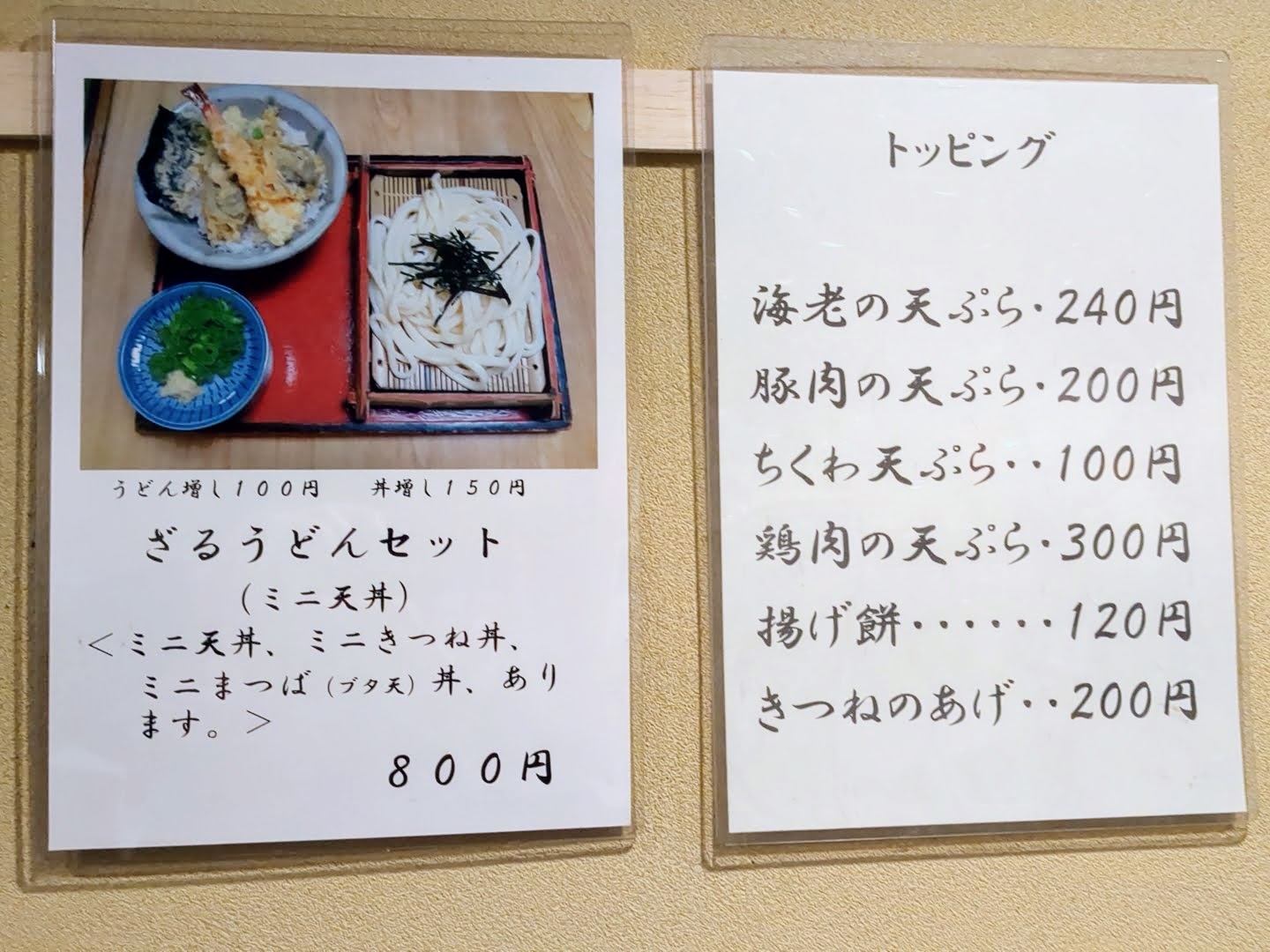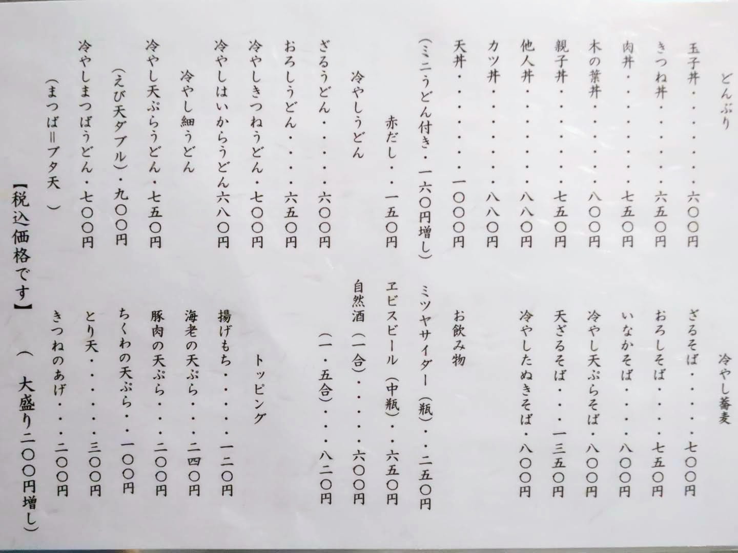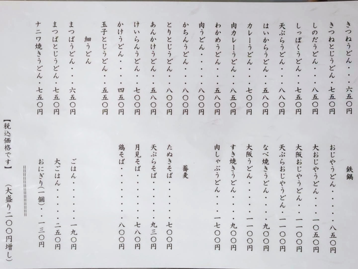 食事のメニューは、うどん、細うどん、鉄板、蕎麦、どんぶり、冷やしうどん、冷やし細うどん、冷やし蕎麦に分類されていました。