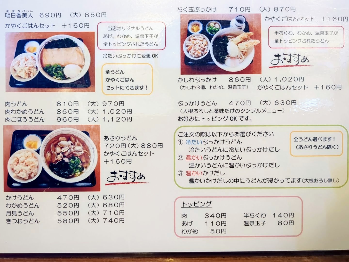 シンプルなうどんは、リーズナブルです。それぞれトッピングがセットになったメニューがありました。