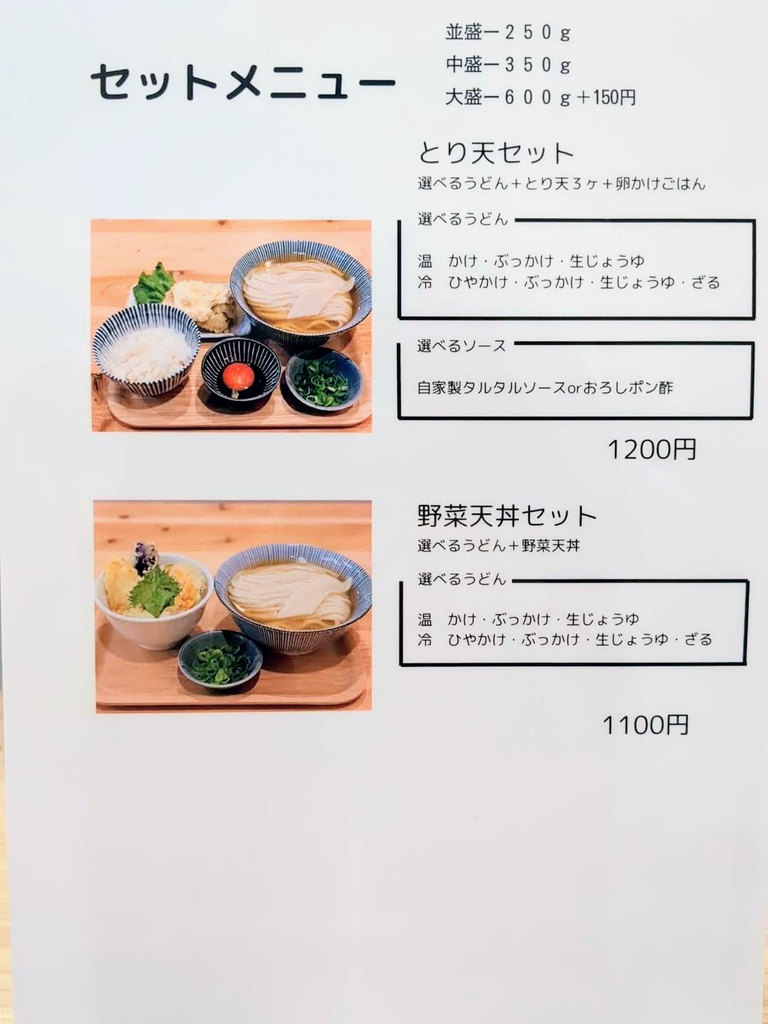 うどんの量は、並盛250g、中盛350gで、料金は同じです。大盛600gはプラス150円です。食券を手渡すときに、うどんのサイズを聞かれました。