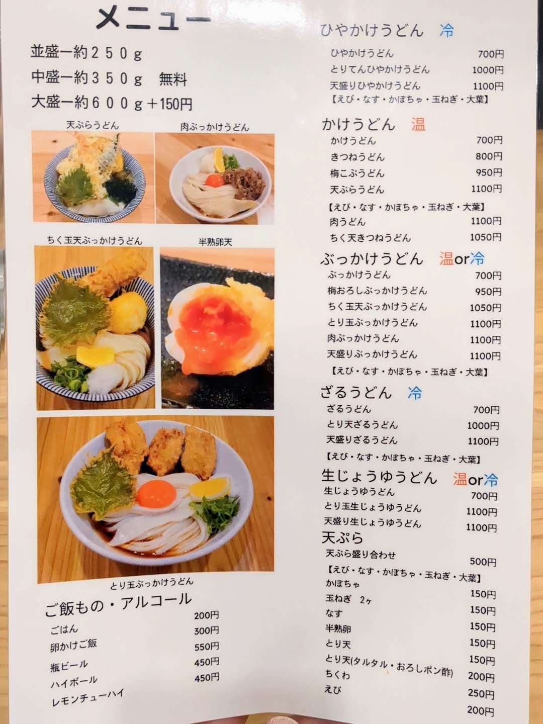 うどんの単品メニューは、ひやかけうどん、かけうどん、ぶっかけうどん、ざるうどん、生じょうゆうどんに分類されていました。