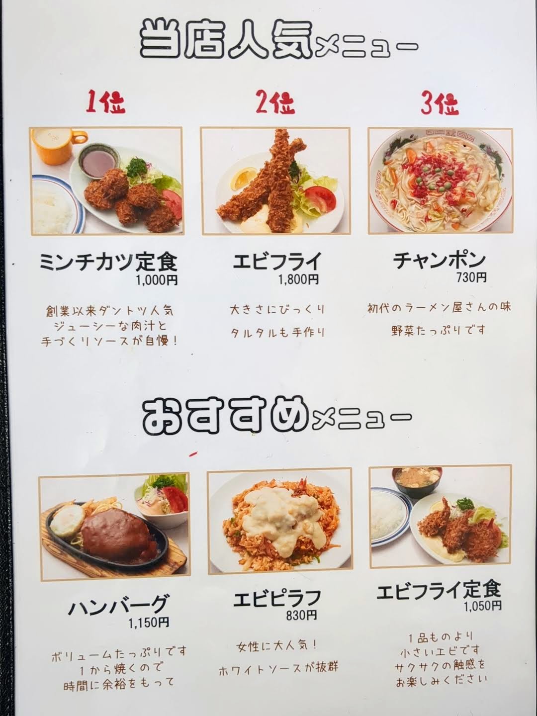 ミンチカツ定食(税込1,000円)が、レストラン若竹の1番人気のメニューです。2番人気はエビフライ単品(税込1,800円)、3番人気はチャンポン(税込730円)となっていました。