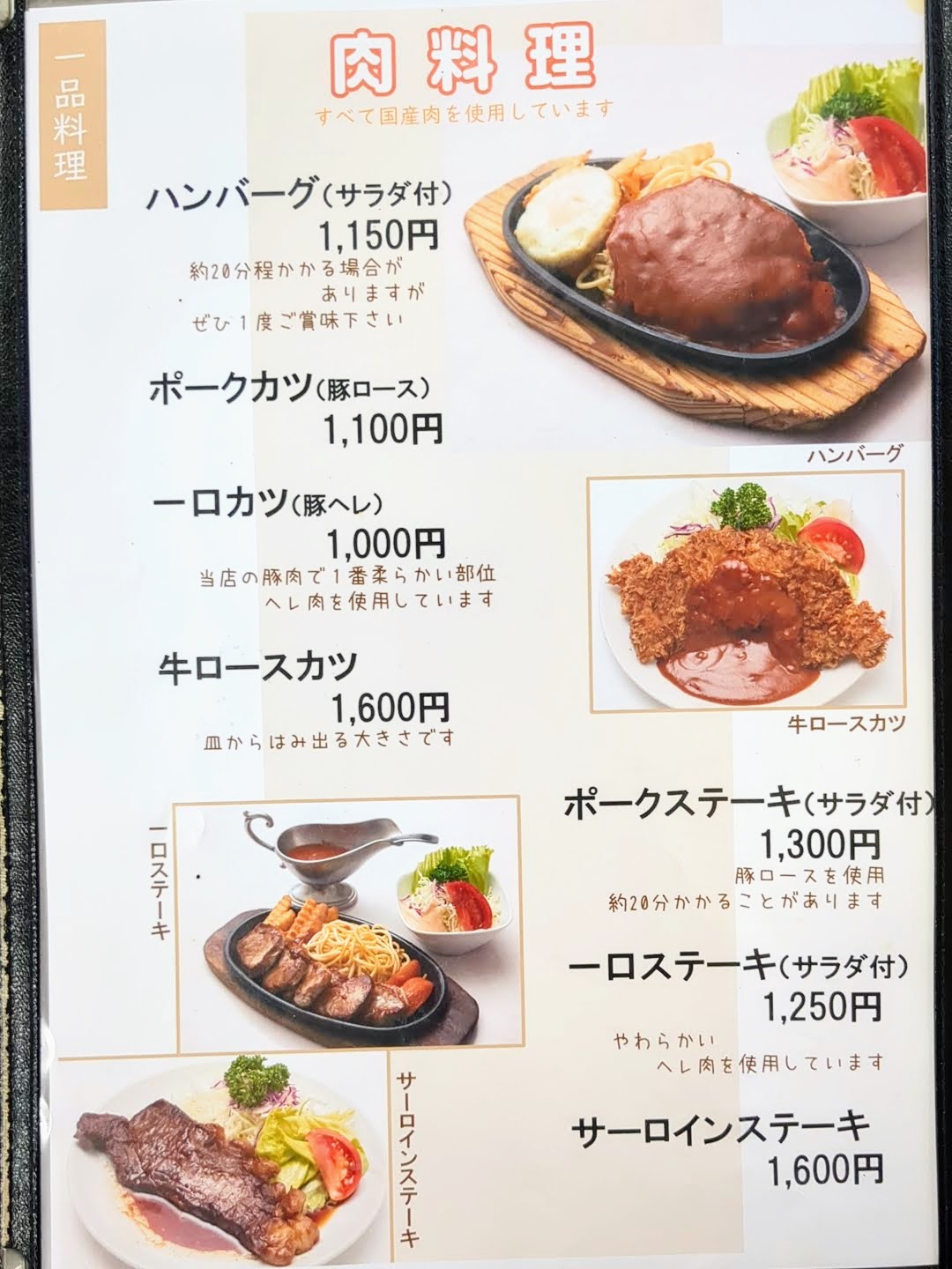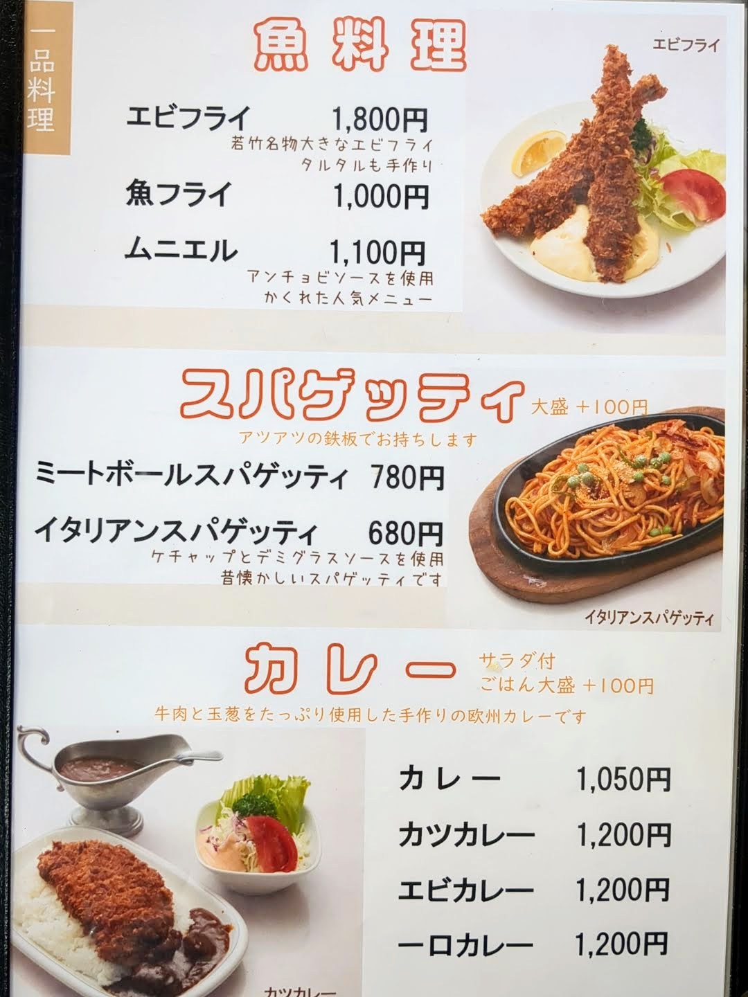 メニューは、定食、肉料理、魚料理、スパゲティ、カレー、ご飯もの、スープ、中華料理に分類されていました。